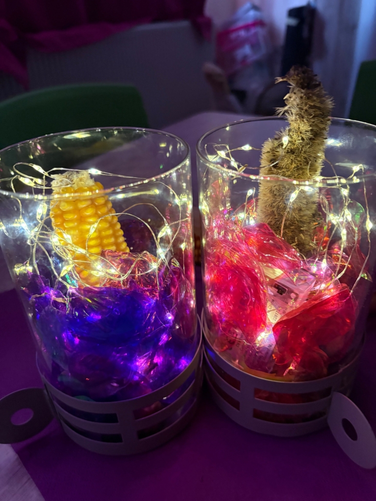 Die beiden großen Gruppen haben buntes Wasser eingefroren und daraus Eispilze entstehen lassen. Natürlich wurden auch noch andere Dinge eingefroren.