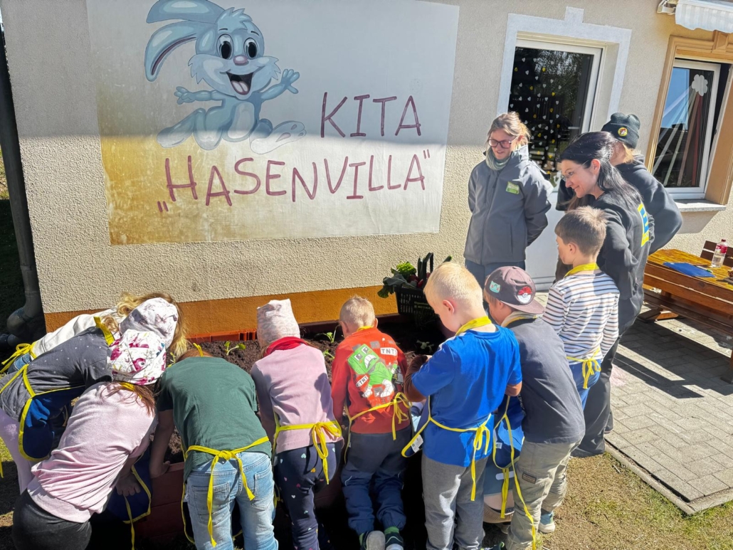 Die Kinder freuten sich so sehr, als das Edeka Stiftungsteam zur Bepflanzung unseres Hochbeetes den Termin bestätigten. Heute war es endlich soweit und es hieß „Schürzen an und Gießkannen raus!“ Zwei Mitarbeiterinnen und Frau Kulla besuchten die Kita und bepflanzten mit den Kindern der Eulengruppe das Hochbeet mit vielen verschiedenen Gemüsesorten.